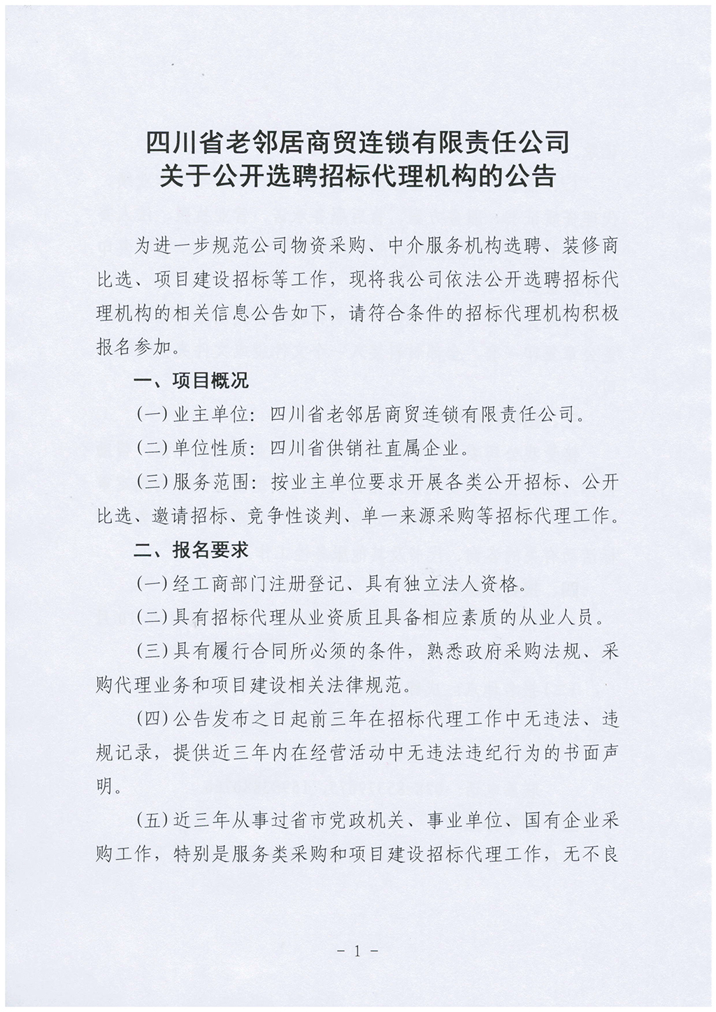四川乾新招投標(biāo)代理有限公司受四川省老鄰居商貿(mào)連鎖有限責(zé)任公司的委托,擬對四川省老鄰居商貿(mào)連鎖有限責(zé)任公司2022